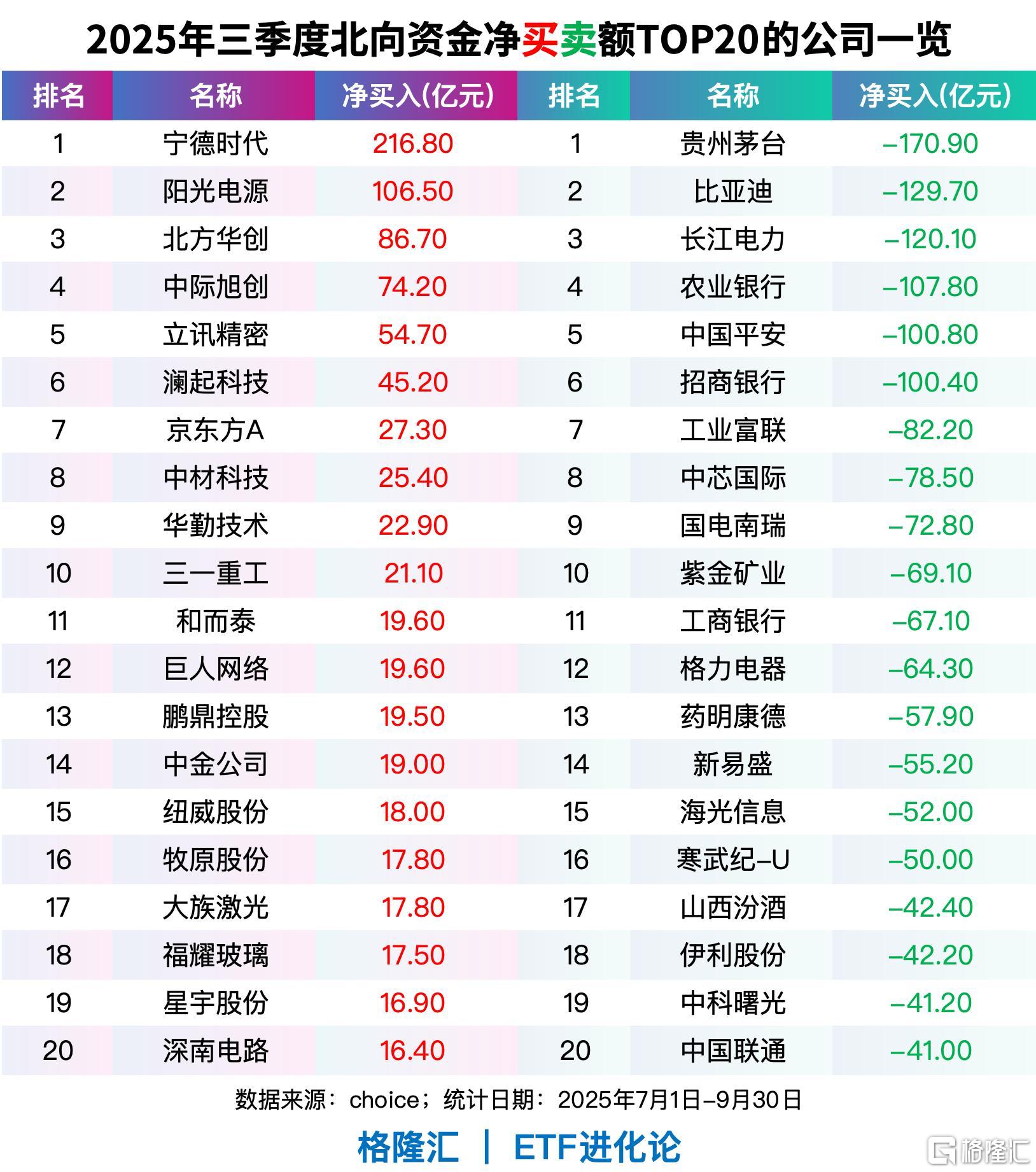 北向资金三季度净买入金额前十的股票分别为宁德时代、阳光电源、北方华创、中际旭创、立讯精密、澜起科技、京东方A、中材科技、华勤技术、三一重工,净买入金额依次为216.80亿元、106.50亿元、86.70亿元、74.20亿元、54.70亿元、45.20亿元、27.30亿元、25.40亿元、22.90亿元、21.10亿元、