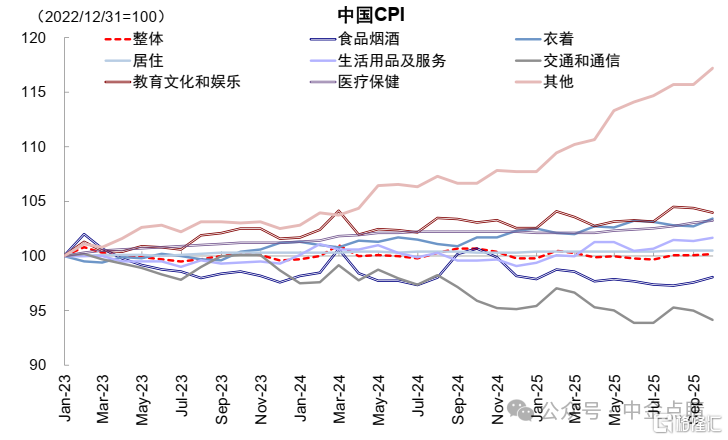 ► 其次,当前的宏观环境也不是一个简单的通胀或通缩就能概括的。对于中国,虽然受地产和上游资源品影响,整体经济和表观价格特别是PPI依然处于下行区间,但过剩的流动性导致但凡是有回报甚至有回报预期的“稀缺”资产都会因为资金的大量涌入而涨价,呈现局部通胀现象,此前的国债和分红、当前的黄金和科创,都体现了相对的通胀(即相对购买力下降),即便是CPI的分项中也体现了这一通缩和通胀并存现象。因此,更确切地讲,中国当前的局面应该是整体物价下行掩盖下的过剩流动性和局部通胀,这才会有分红和成长都涨,本质是流动性对稀缺回报的追求。