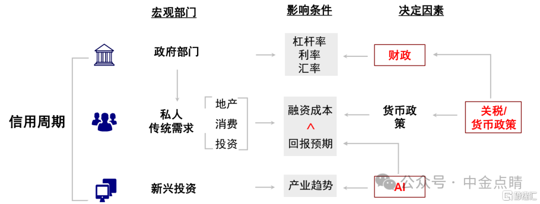 信用扩张的主体可分为政府部门和私人部门,从决定因素上又可以进一步分为三大块:一是以AI为代表的新产业趋势,二是政府主导的财政刺激,三是以地产消费和传统制造业为代表的私人部门传统需求。这三块中,除政府支出外,另外两块本质上都取决于各自投资回报率与融资成本间差距的大小,例如决定地产的租金回报率与居民购房的按揭利率。