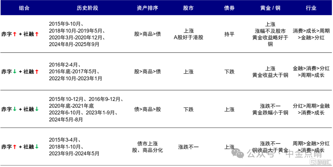 如果是这一情形的话,参照历史经验,1)“财政弱+社融弱”:意味着政策发力较慢,债券>商品>股市,信用收缩压力更大,商品和股市承压,板块排序通常为分红>周期>金融>消费>成长,外部不确定性较高的环境下,黄金或继续受益于避险与储值需求并跑赢铜。2)“财政强+社融弱”:意味着政策发力对冲,股市涨跌取决于财政发力的力度和方向,债券受益,板块排序通常为周期>金融>分红>消费>成长,基建投资发力支撑周期板块,铜跑赢黄金。