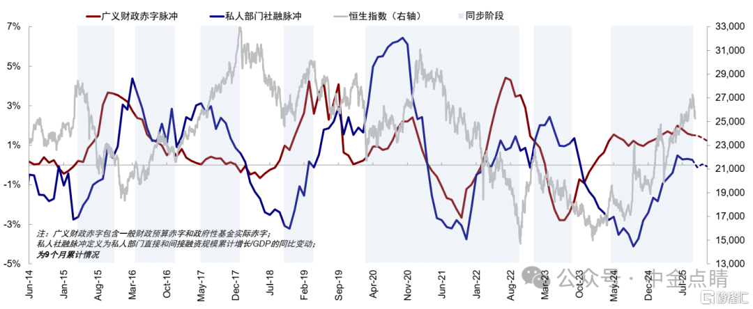 多数情况下,广义财政赤字和私人部门社融脉冲都不会同步,毕竟二者出发点不同。私人部门融资主要反映经济的自发需求,而政府财政天然具有逆周期调节功能。当经济下行时,政府会加大财政支撑,而经济过热时则适度收敛,所以广义财政赤字脉冲和私人部门社融脉冲多数时间互相对冲。在某些阶段,因为政策响应速度的问题,也会同步向上或向下。因此,我们既要观察整体走向,也要拆开看由谁驱动,以判断对资产表现的不同含义。