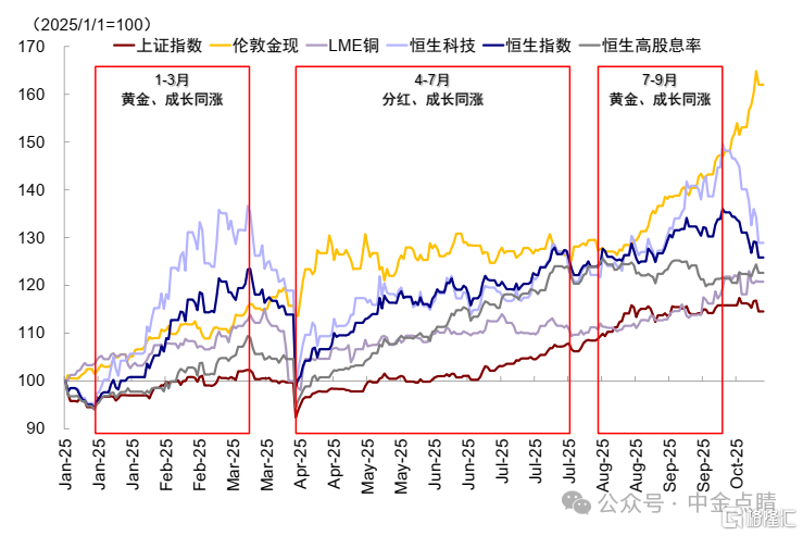 今年整体强劲的市场环境中,有一些让人颇为费解的地方,例如风险(美港A三地的成长股)和避险资产(黄金)同涨,通缩(分红)与通胀(黄金)资产同涨。正常情况下,黄金、分红和成长这三大类不同属性的资产定价底层逻辑是不同的:黄金更多反映避险和储值价值,分红在通缩或防御环境下跑赢,成长则对应通胀和风险偏高改善的环境。但是反观今年,1-3月黄金与成长同涨,4-7月为分红与成长同涨,7-9月又是黄金与成长同涨,看起来不合常理。