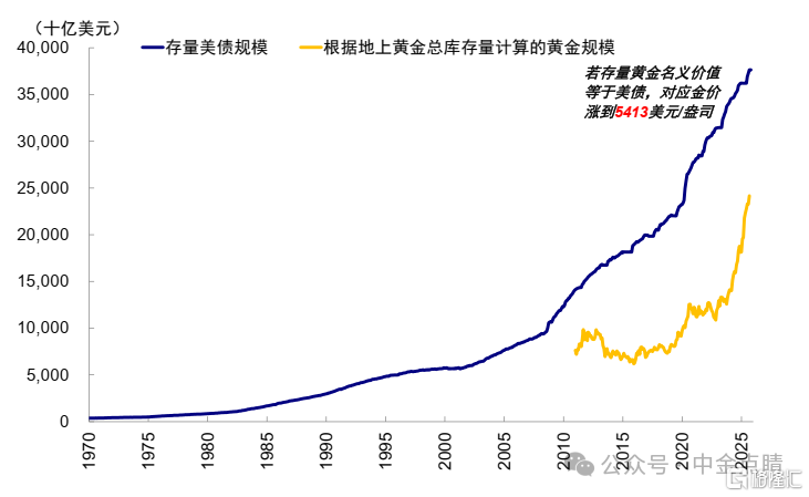 图表4:金价超过5500美元/盎司,黄金的存量总价值就会超过存量美债的38万亿美元