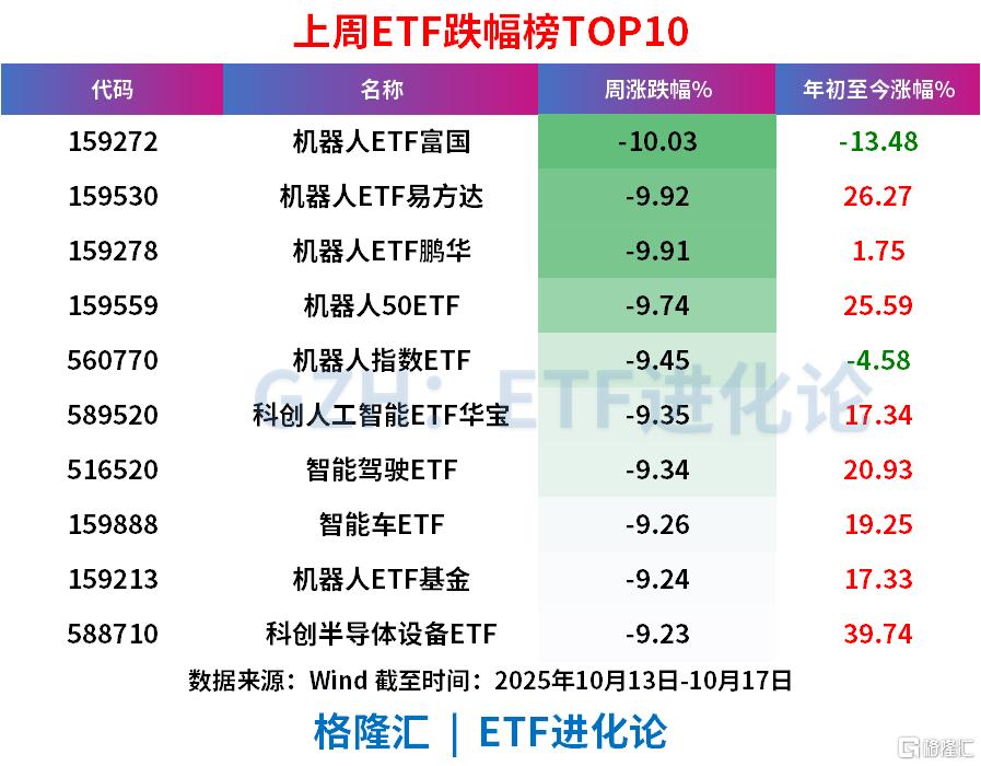 机器人ETF富国、机器人ETF易方达、机器人ETF鹏华、机器人50ETF、机器人指数ETF上周分别跌10.03%、9.92%、9.91%、9.74%、9.45%。