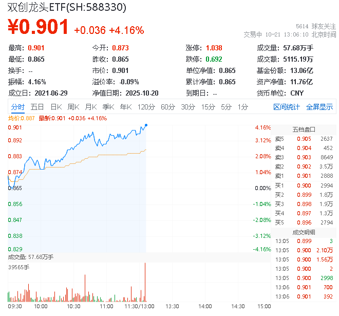 10月21日,截至13时5分,科创、创业板块表现强劲,中证科创创业50指数上涨4.1%,成份股方面,新易盛领涨11.35%,中际旭创上涨10.92%,天孚通信上涨6.58%。
