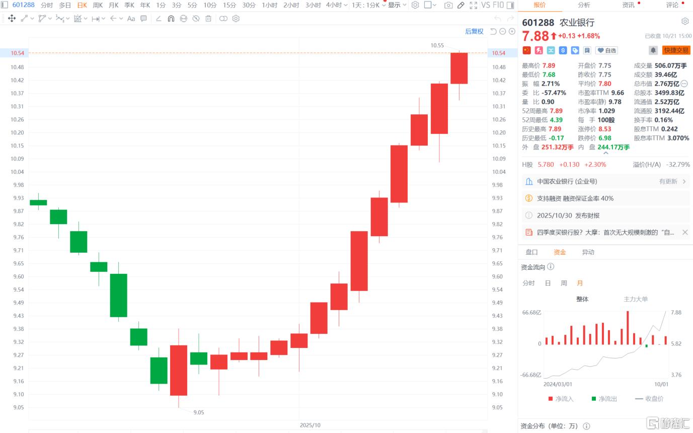 个股方面,农业银行走出13连阳,再创历史新高,年内累涨超53%。摩根士丹利认为,第四季度即将到来的股息派发、利率企稳、5000亿元人民币结构性金融政策工具支撑,以及更可持续的政策路径,都将支撑中国银行业股票的重估。投资者新的关注点应转向那些在“自然出清”环境中盈利更早、更强劲反弹的优质银行。