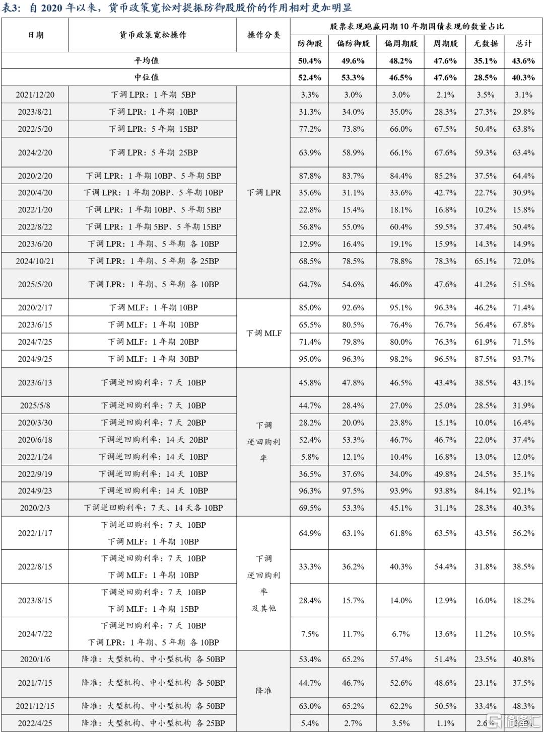 当货政宽松带来债市“走熊”时,如果权益市场对产业基本面及上市公司利润、现金流改善预期不明确,那么货币政策或难改变权益市场主线,防御股仍有可能大比例跑输同期债券表现。