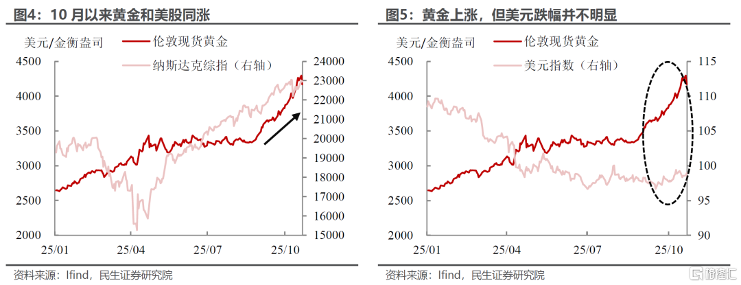 如果说之前的上涨,市场还可以用美联储顶着通胀的过度宽松预期、美元信用以及政府关门来解释,但是最近一两周黄金和股票等风险资产同涨,并且丝毫不惧美元的反弹,这多少有些颠覆了传统的逻辑。