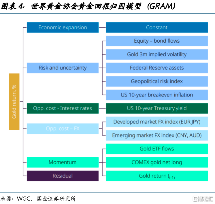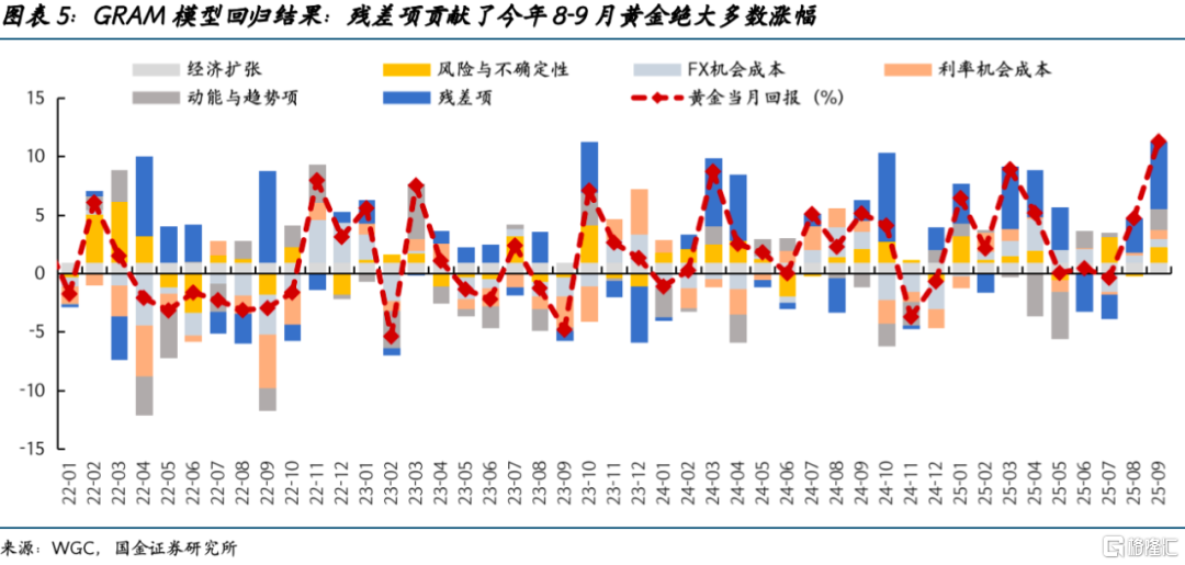 世界黄金协会的黄金回报归因模型(GRAM)将黄金每月回报率拆成“5+1”个因子——①经济扩张、②风险与不确定性、③FX机会成本、④利率机会成本、⑤动能与趋势项、⑥残差项。