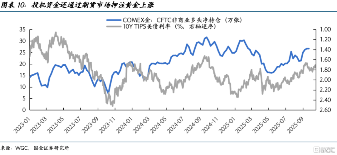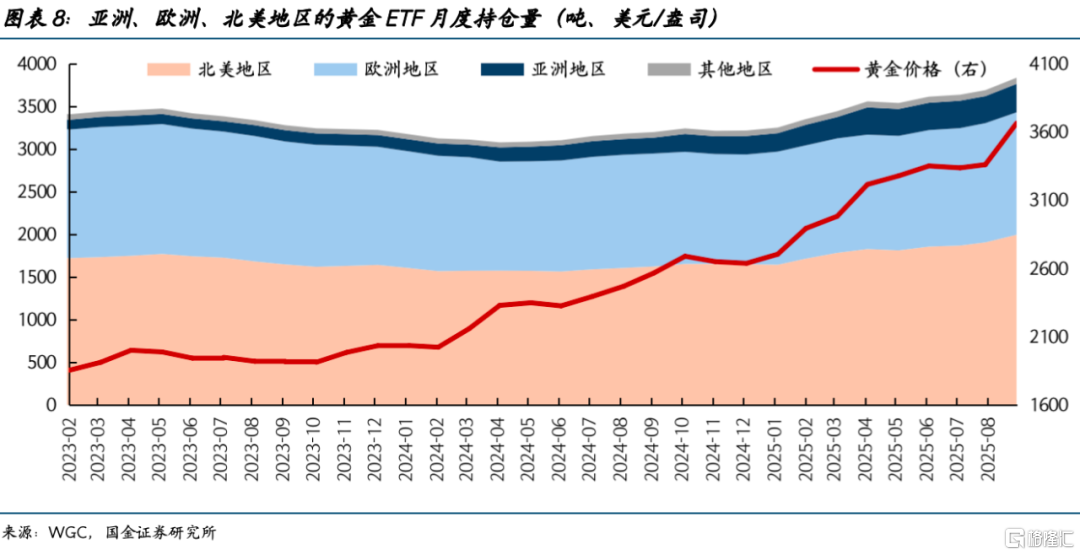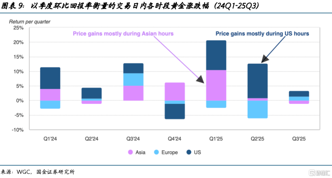 本周以前,市场都在持续加速定价美联储货币宽松的幅度。从资金来源看,8-9月欧美黄金现货ETF的资金流入是金价上涨的最主要驱动力,亚洲ETF的净流入并没有明显的增长,反映出美联储政策转向后,欧美资金正在加速确认降息的幅度可能超预期。期货市场上CFTC黄金非商业净多头仓位上升,以及日内黄金美盘、欧盘时段较亚盘更明显的涨幅也可以说明这一点。