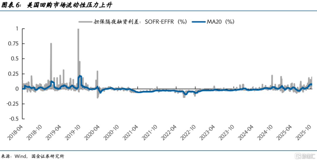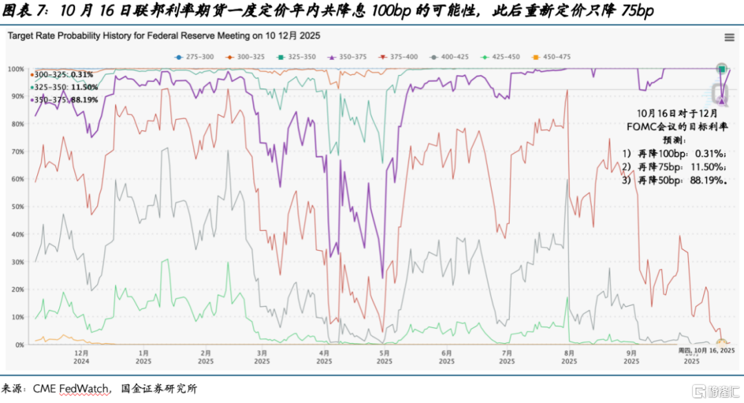10月14日,鲍威尔在全美商业经济协会(NABE)年会上表达了对就业下行风险的担忧,同时称FOMC计划在准备金水平略高于“充足”标准时停止缩表,试图避免重演2019年9月的流动性危机局面。期货市场一度开始定价年底前出现单次降息50BP的可能性,黄金应声上涨。