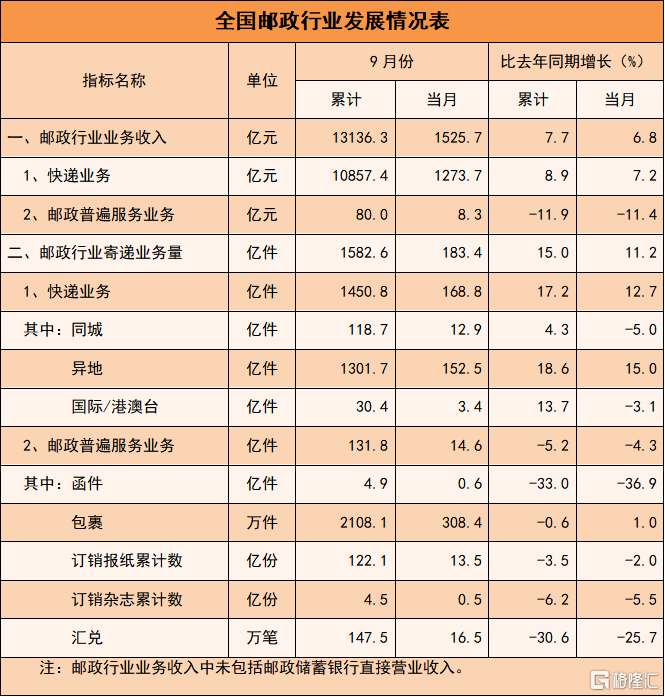 9月份,邮政行业业务收入(不包括邮政储蓄银行直接营业收入)完成1525.7亿元,同比增长6.8%。其中,快递业务收入完成1273.7亿元,同比增长7.2%。