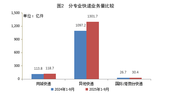 1—9月,同城快递业务量累计完成118.7亿件,同比增长4.3%;异地快递业务量累计完成1301.7亿件,同比增长18.6%;国际/港澳台快递业务量累计完成30.4亿件,同比增长13.7%。