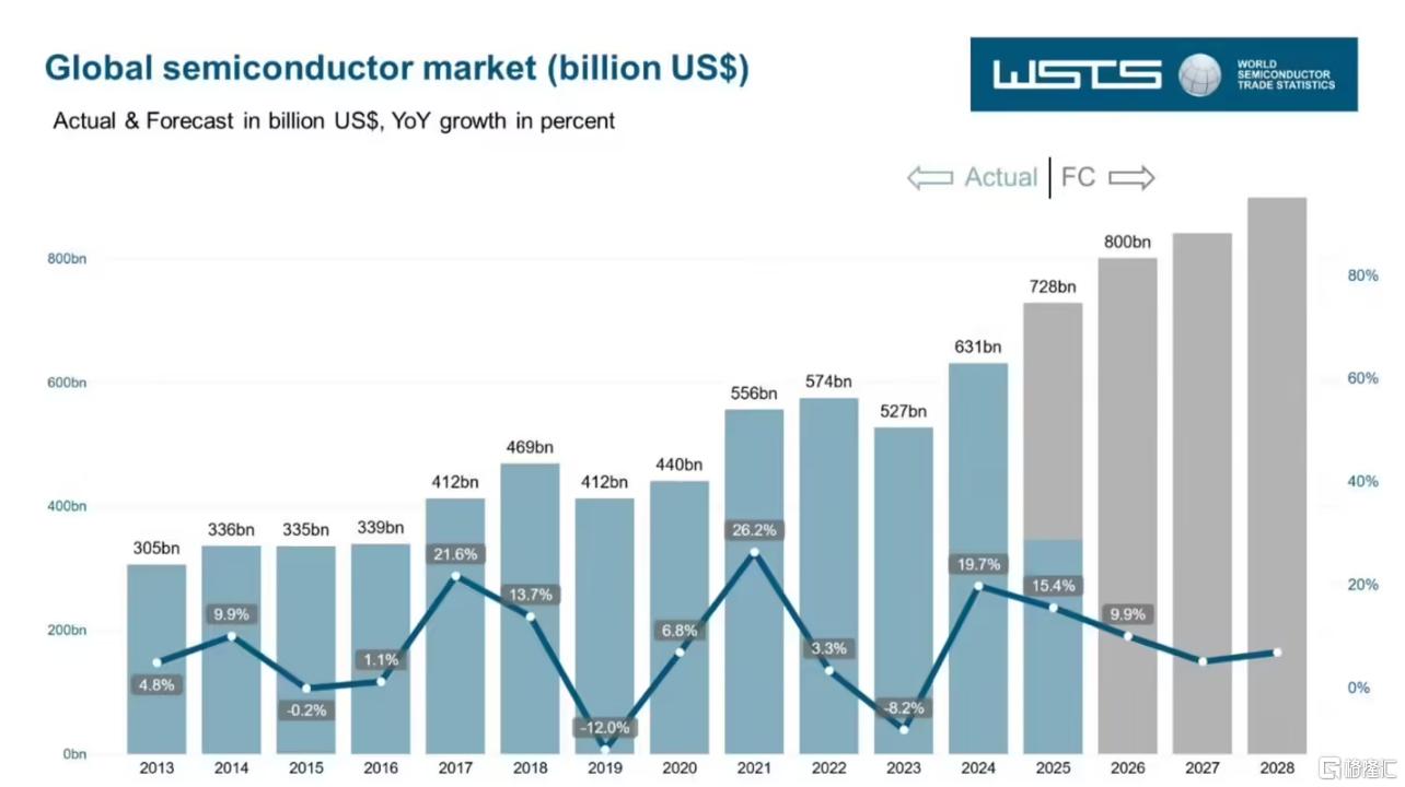 WSTS预测,2025年市场规模预计将达到7280亿美元,同比增长15.4%;2026年则有望达到8000亿美元,同比增长 9.9%。