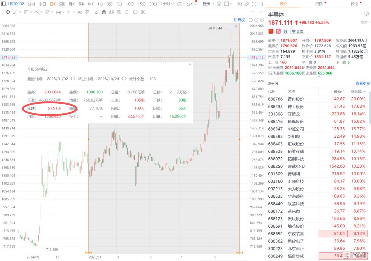 年初至今,A股半导体板块累计涨幅超50%。