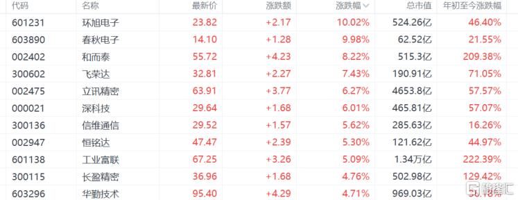 消费电子板块大涨,环旭电子、春秋电子涨停,和而泰涨超8%,立讯精密涨超6%。消息面上,苹果计划于2026年底推出一款与Meta雷朋智能眼镜相抗衡的AI眼镜产品,内并搭载苹果自研的全新芯片。iPhone 17仍需求强劲,苹果将于美东时间10月30日发布财报,高盛绩前力挺,预计苹果营收与每股收益(EPS)均将超市场共识。