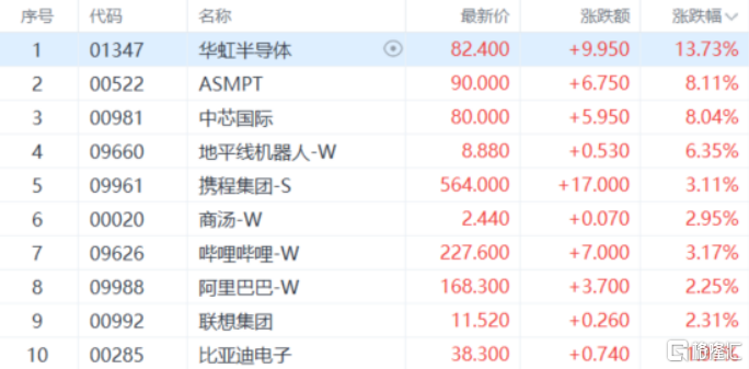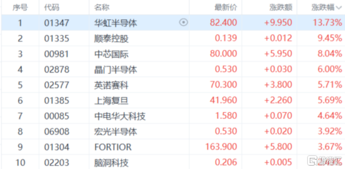 半导体板块爆发,华虹半导体涨超13%,顺泰控股、中芯国际、晶门半导体、英诺赛科、上海复旦等跟涨。