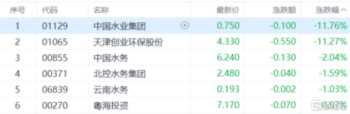 水务股下挫,中国水业集团、天津创业环保股份跌超11%,中国水务、北控水务集团、云南水务、粤海投资等多股跟跌。