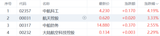 军工股上涨,中航科工涨超4%,航天控股、中船防务、大陆航空科技控股等跟涨。