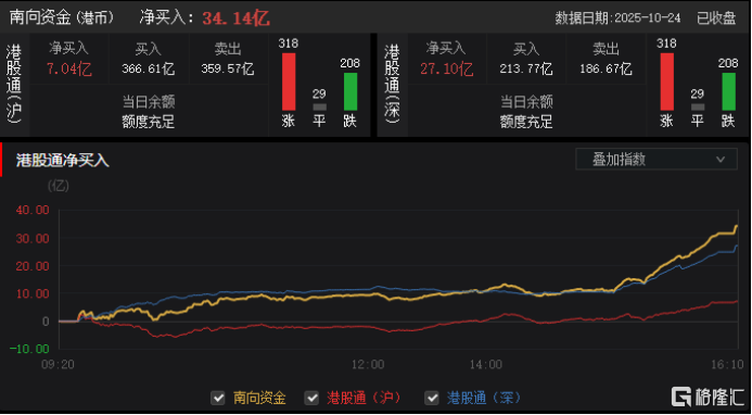 今日,南向资金净买入34.14亿港元,其中港股通(沪)净买入7.04亿港元,港股通(深)净买入27.1亿港元。