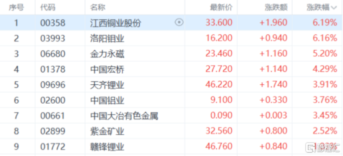 有色金属板块活跃,江西铜业股份、洛阳钼业涨超6%,金力永磁、中国宏桥、天齐锂业、中国铝业、中国大冶有色金属等跟涨。