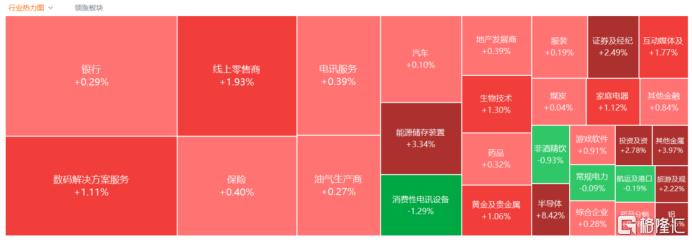 盘面上,大型科技股普遍上涨但总体涨幅波动不大,其中,阿里巴巴、快手涨超2%,百度、网易涨超1%,腾讯、美团、京东小幅上涨,惟小米逆势下跌近2%;芯片半导体股表现抢眼,华虹半导体大涨近14%领衔;军工股集体活跃,中资券商股午后拉升明显,黄金、铜、铝等有色金属板块齐涨。另一方面,水务股、核电股、新消费概念股、内房股、燃气股、煤炭股多数表现低迷。