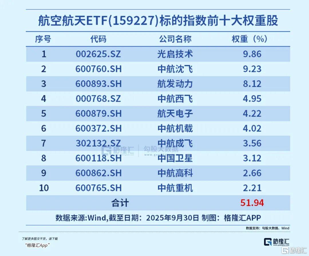 航空航天ETF(159227)前十大权重股成份股包含光启技术(超材料隐身技术)、中航沈飞(歼击机整机制造)、航发动力(航空发动机)、中航成飞(无人机系统制造)等。