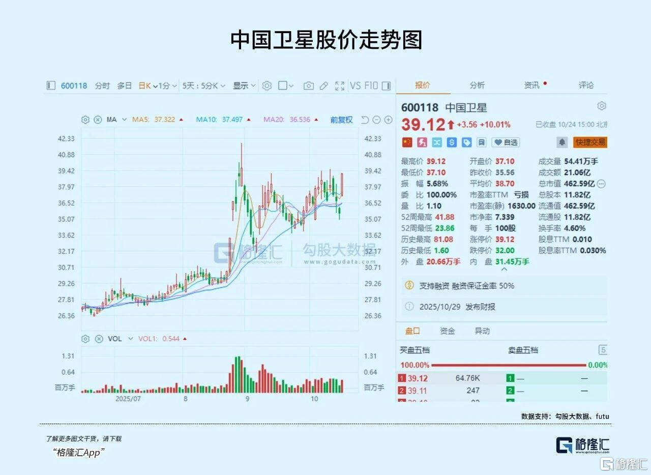 值得一提的是,10 月 23 日晚,长征五号运载火箭成功发射通信技术试验卫星二十号,直接提振市场对航天产业链的信心,中国卫星作为卫星研制核心标的,当日封死涨停,同时也进一步刺激了市场的交易热情。