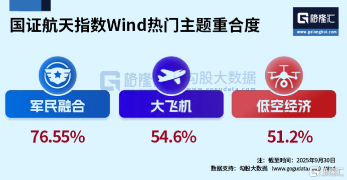 综合来看,通过相关ETF基金来布局往往是市场更加认同的稳健策略。比如航空航天ETF(159227)跟踪指数国证航天指数,堪称可以一键实现“军工+卫星”双轮驱动,其在申万一级行业分类中,与国防军工权重占比高达98.2%,是全市场最“纯”军工指数,同时该指数与低空经济、卫星互联网、商业航天等热门主题高度契合——与申万二级行业的“航空装备+航天装备”权重合计超68%,与军民融合含量高达76.55%,与大飞机和低空经济的含量也均超50%。