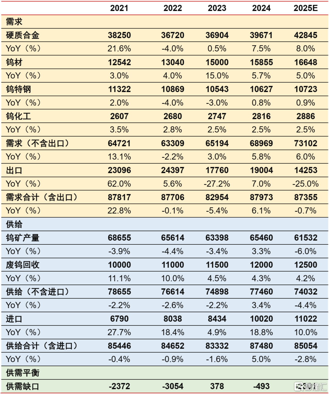 2021-2026年国内钨行业供需平衡表(单位:金属吨)