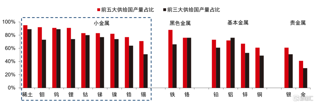 在关键矿产中,以稀土、钴、锡为代表的小金属兼具产量小且供给集中度高的特点,前五大供给国占全球产量比重平均在85%以上。若主要供给国收紧供给约束,其全球供应受影响程度或较大。