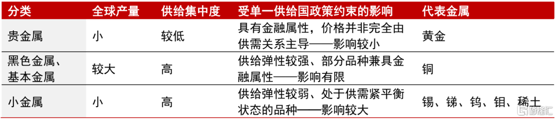 在关键矿产中,以稀土、钴、锡为代表的小金属兼具产量小且供给集中度高的特点,若主要供给国收紧供给约束,其全球供应受影响程度或较大。建议关注小金属供需格局变化带来的配置机会。