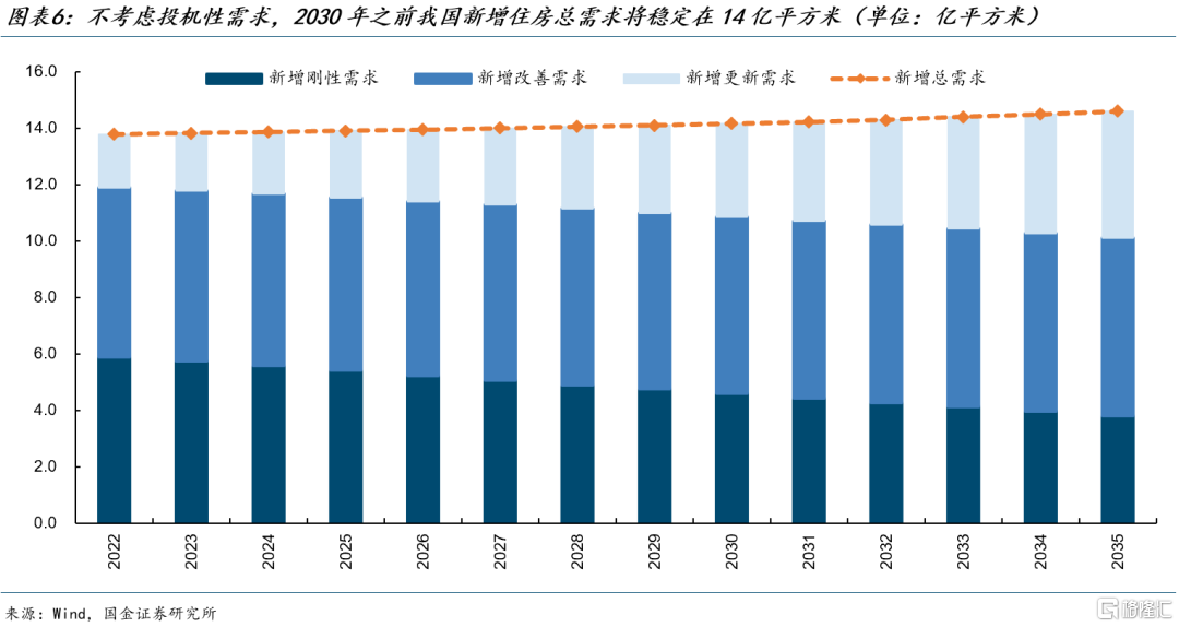 根据我们测算,在2030年之前,不考虑投机性需求,新增住房需求(新建+二手)将大致稳定在14亿平方米左右,当前可能已经达到了稳态水平。