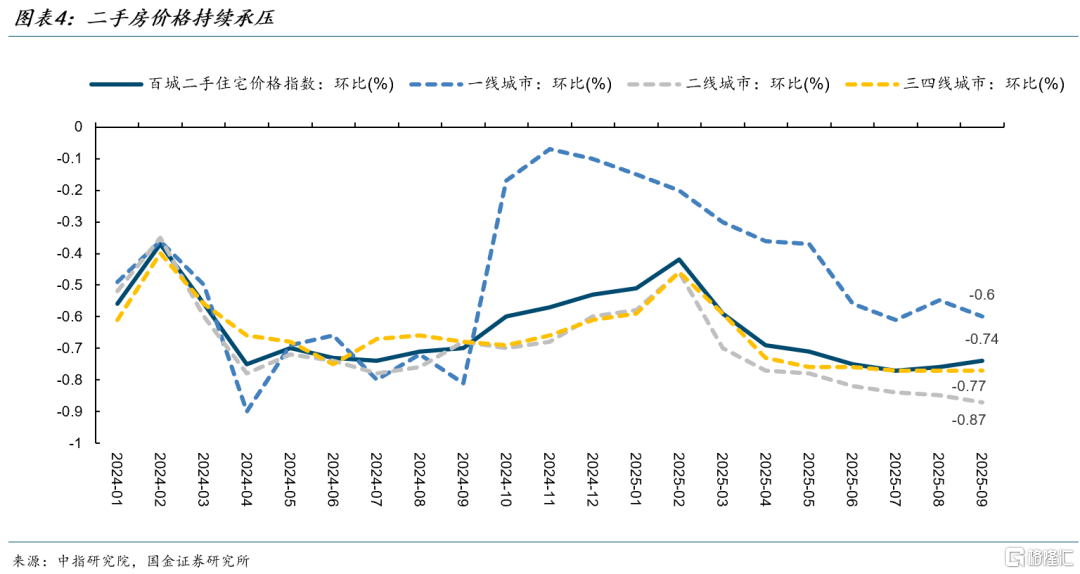 今年1-9月,18个样本城市二手房成交面积同比增长17.1%,9月同比增长29.7%,较8月3.1%增速显著改善。与此同时,二手房价格持续承压。9月百城二手住宅价格环比回落0.7%,为连续41个月环比下跌,同比增速为-7.4%,降幅较8月略有走阔。尽管各能级城市的二手住宅价格均处于下跌区间,但二线城市的跌幅最为显著。9月一线、二线和三四线城市二手住宅价格环比分别为-0.6%、-0.9%和-0.8%,同比增速分别为-4.0%、-8.3%和-7.9%。