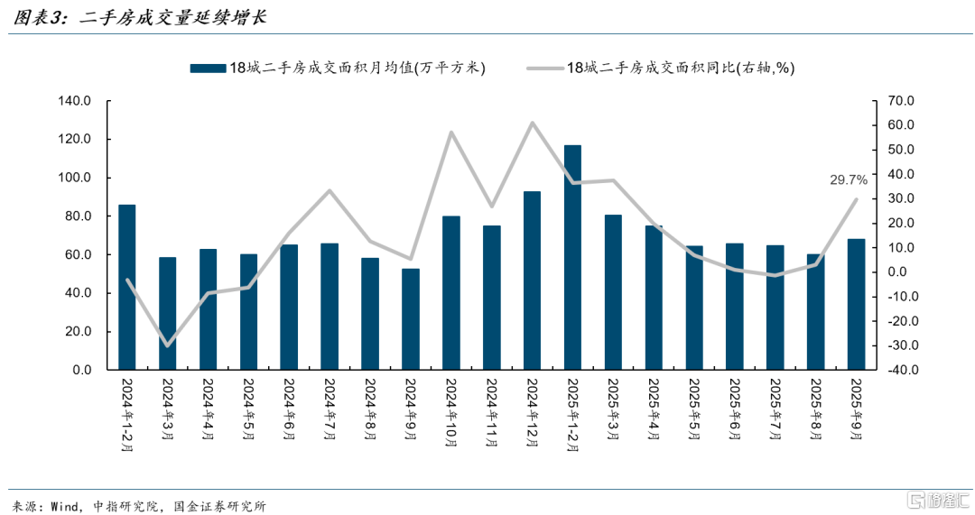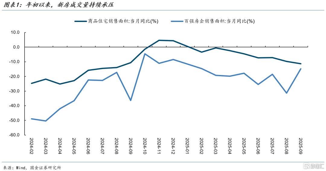 年初以来,新房成交面积持续承压。1-9月商品住宅销售面积同比下降5.6%,9月同比下降11.4%,较8月9.7%降幅走阔。1-9月百强房企销售面积1.2亿平方米,同比下降20.1%。其中,9月同比-14.7%,较8月-31.3%增速改善。