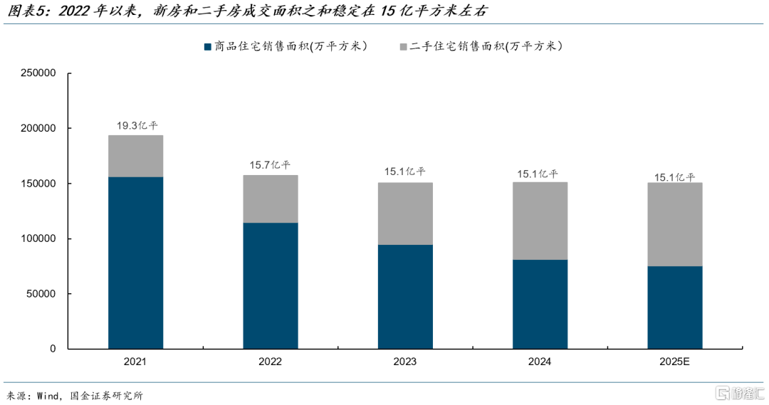 如果将二手房成交纳入考量,我国新建住宅+二手住宅总成交面积从2021年的19.3亿平方米大幅下滑至2022年的15.7亿平方米以后,2023、2024年基本稳定在了15亿平方米左右的水平,预计2025年也将继续保持这一水平。
