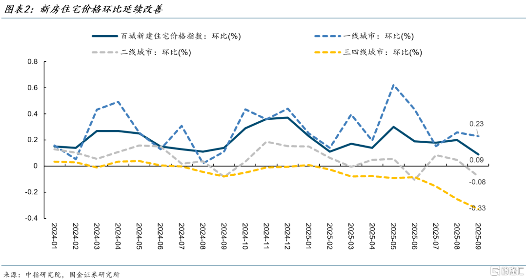 新房住宅价格延续上涨态势。根据中指研究院数据,9月百城新房住宅价格同比上涨2.7%,环比增长0.1%。分城市能级看,新房价格显著分化,一二线城市和三四线城市呈现“冷暖不均”的格局。其中,9月一线和二线城市同比增速分别为4.0%和0.6%,环比增速分别为0.2%、-0.1%,三四线城市同、环比增速分别为-1.2%、-0.3%。