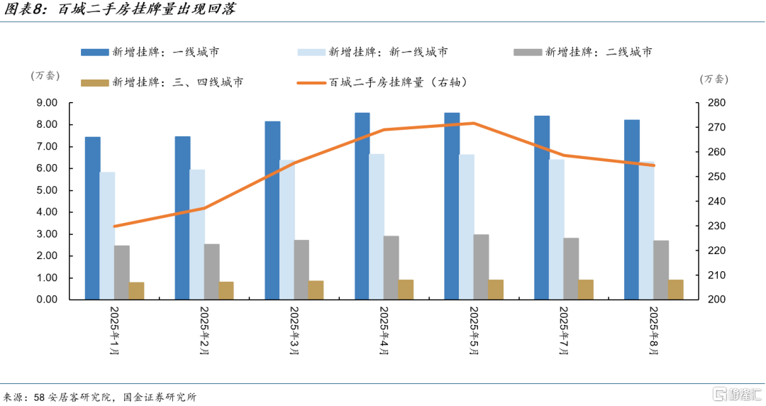 但二手房挂牌增长最快的阶段已经过去,二手房市场已进入“去库存”阶段。根据58安居客研究院数据,百城二手房挂牌量自7月以来出现回落,各能级城市的新增挂牌量开始下降。其中,一线、新一线、二线城市8月新增二手房挂牌量分别为8.2、6.3、2.7万套,环比减少0.2、0.1、0.1万套,三四线城市新增挂牌量为0.9万套,环比持平。这意味着当前二手房市场已进入存量博弈阶段,在经历“最后一跌”之后有望实现止跌回稳。