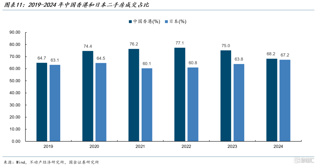 中国内地的住房平均使用寿命约为30年,略高于日本,但低于中国香港的50年,因此在房地产市场进入成熟期后,中国内地二手房的成交占比理论上应该高于日本(60%-63%),低于中国香港(74%-77%)。