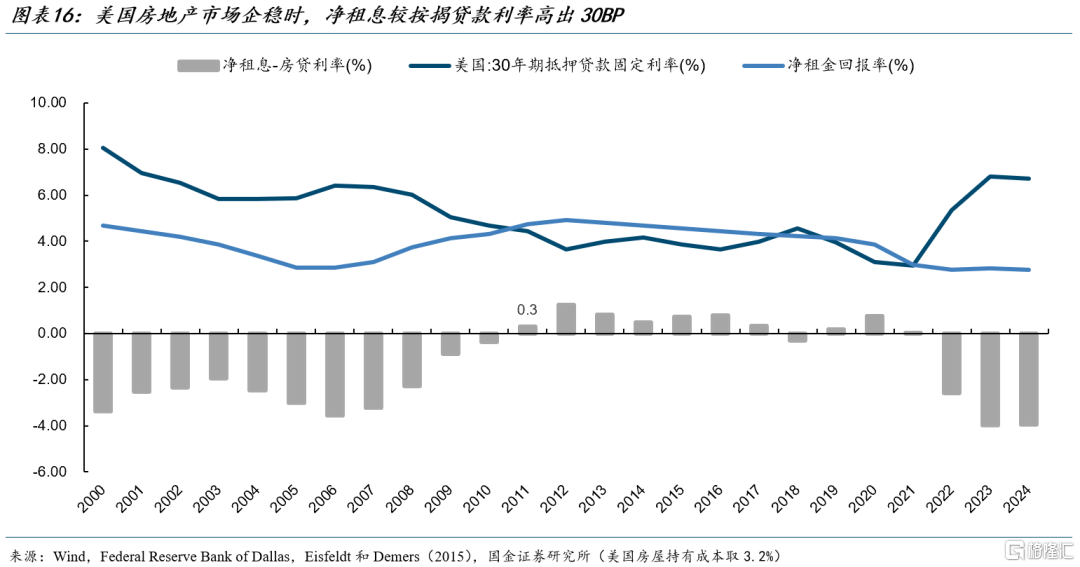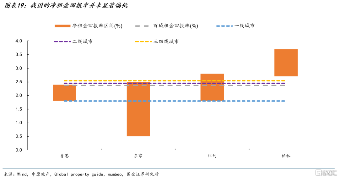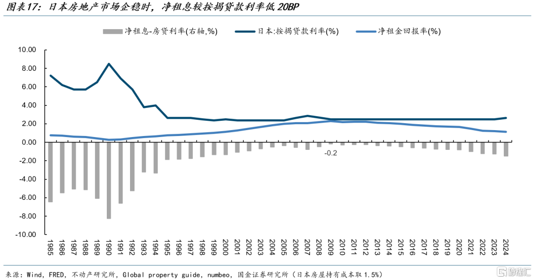 另一方面,结合海外房地产市场止跌回稳的经验,美国和日本的房地产市场企稳时(美国2011年、日本2009年),净租金回报率与30年期按揭贷款利率之差在-20至30BP左右。