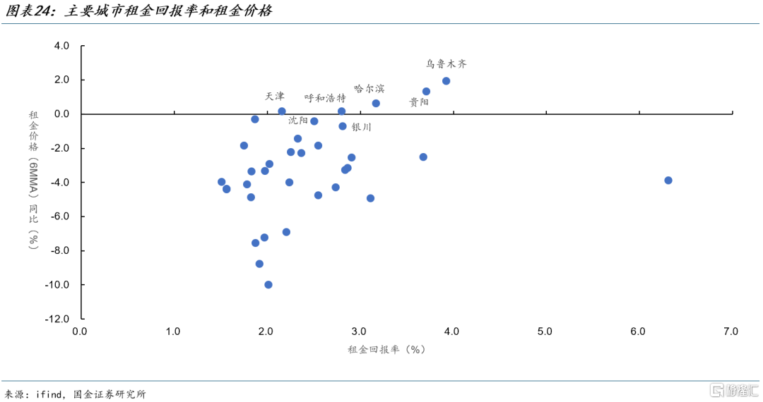 Wind口径下,全国百城租金回报率在2.37%,较合理水平还有10-20BP的距离。按照当前房价的调整速度,预计在明年二季度左右,租金回报率将初步达到合理区间。