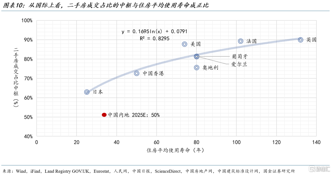 首先,从国际经验看,成熟房地产市场的二手房成交占比通常存在稳定的区间,其决定因素是房子的使用寿命。使用寿命越长,二手房成交占比越高。这背后的逻辑是,超出使用年限的住房通常不会在二手房市场流通,无法形成有效供给。比如,英国的住房平均使用寿命能够达到132年,所以二手房的成交占比最高(90%);而日本的住房平均使用寿命只有25年,其二手房的成交占比中枢最低(63%)。