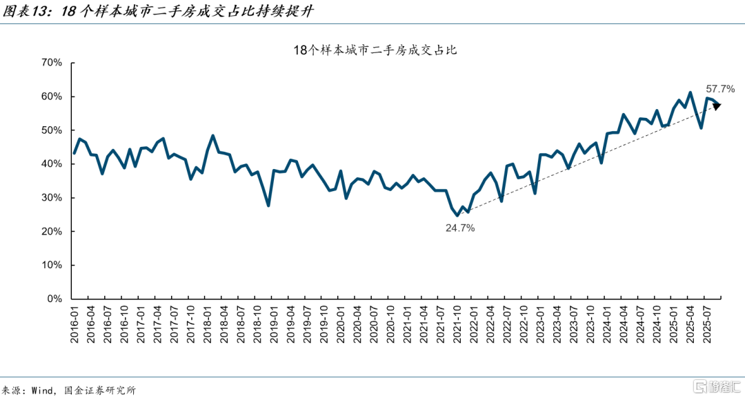 今年1-9月,18个样本城市的二手房成交占比57.2%,较60%-63%的稳态区间下沿相差3-6个百分点。近年来,二手房成交占比年均提升速度在6-8个百分点,按照这一节奏,明年一二季度有望达到合理区间。