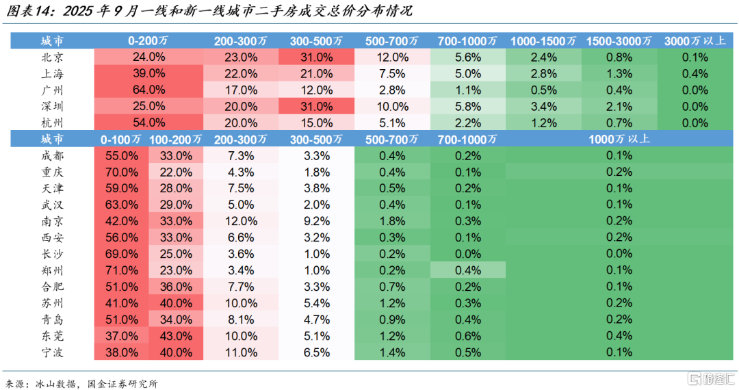 从近期的成交数据看,二手房正在加速“刚需化”。9月北京、上海、广州、深圳成交的二手房总价500万元以下的比例分别为78%、82%、93%、76%,除杭州以外的新一线城市的成交总价则普遍在200万元以下。