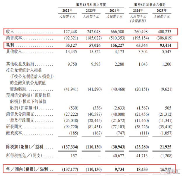 2022年、2023年、2024年和2025年1-6月(报告期),公司的收入分别为1.27亿元、2.42亿元、6.67亿元、4亿元;净利润分别为-1.37亿元、-1.1亿元、973万元、2072万元。