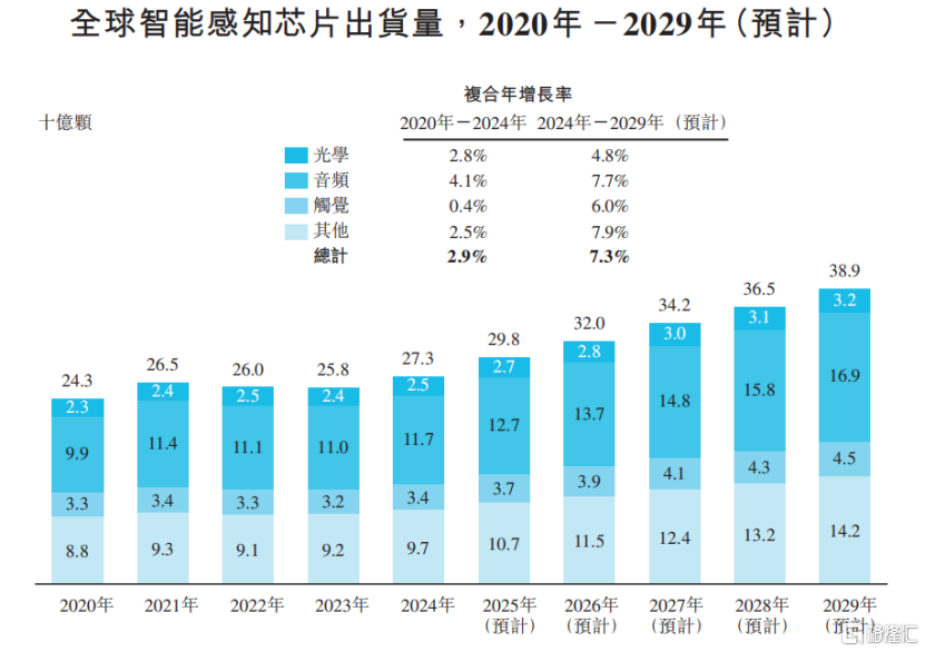 根据灼识咨询,2024年智能感知芯片全球出货量达到273亿颗,并预期到2029年会增长至389亿颗,2024年至2029年的复合年增长率为7.3%,原因为新兴智能设备的普及和消费者对感知能力越来越高的需求。