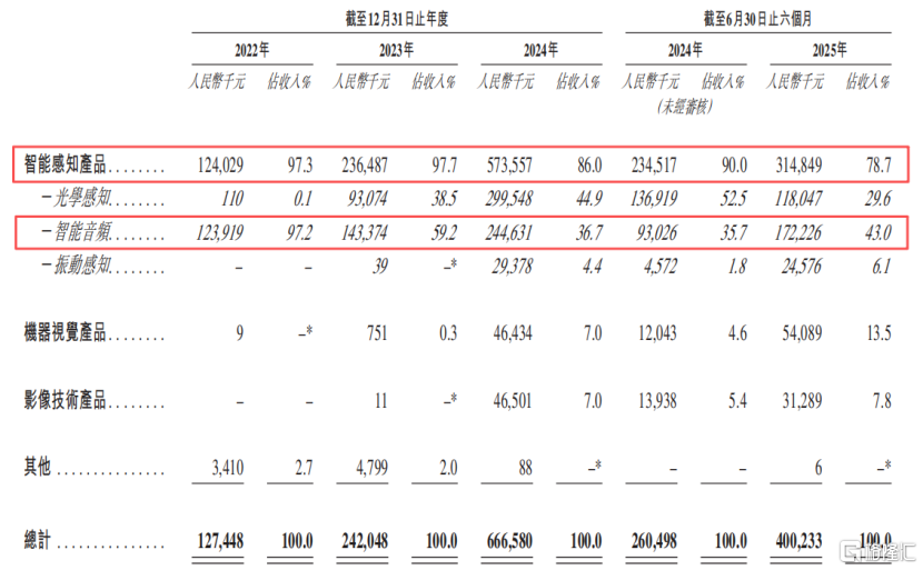 其中,智能音频的收入占比由2022年的97.2%下降至2025年1-6月的43%,而光学感知产品的收入占比则由0.1%提升至29.6%。