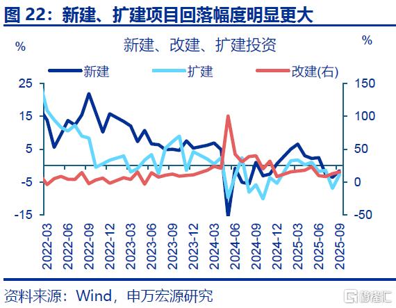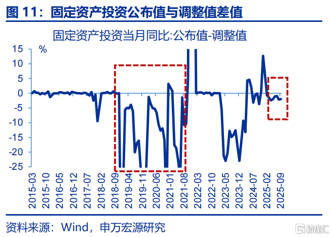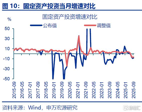 固定资产投资增速的公布值与调整值的偏差较小,反映投资“挤水分”并非年中以来投资大幅回落的主因。2018年起固定资产投资由形象进度法调整为财务支出法,基数调整后固定资产投资增速与按照累计值计算的当月同比(未做调整)存在较大偏差,单月最高达59.3个百分点。相比之下,2025年下半年以来,根据公布值计算的当月同比回落9.1个百分点至9月-8.4%,降幅与回溯调整后的当月同比(-9.2pct至-6.5%)近乎一致,或说明近期投资大幅回落并非统计调整所致。