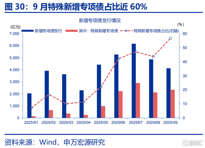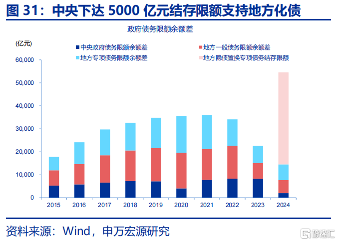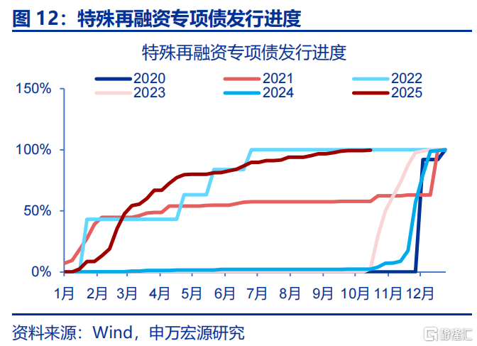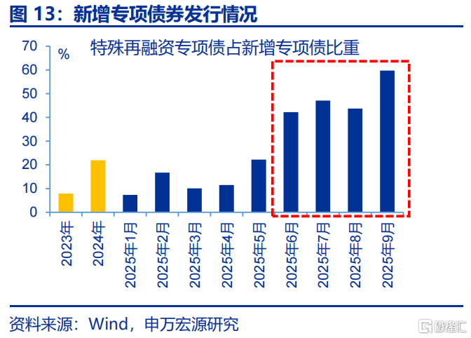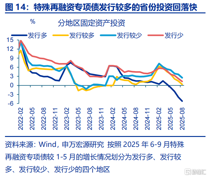 年中以来化债提速挤占投资资金,才是主导投资下滑的主因,可解释超一半的投资下滑幅度。今年财政部在新增专项债中划拨8000亿额度用于发行特殊再融资债,支持化债;但6月来,特殊再融资专项债发行规模上升至1.2万亿,额外占用4000亿元新增专项债额度,相应导致政府投资可用资金减少,该因素对投资增速的拖累超3个百分点,接近整体投资回落幅度(-7.5pct)的一半;结构上,中西部建安投资仍保持正增长,但发行特殊再融资专项债较多的东部地区增速大幅下滑至-5%以下;近期中央安排5000亿元结存限额用于化债和扩大投资,规模接近化债占用资金,结构上也是投向今年集中化债的东部地区等经济大省,恰恰旨在对应缓解化债形成的投资压力。