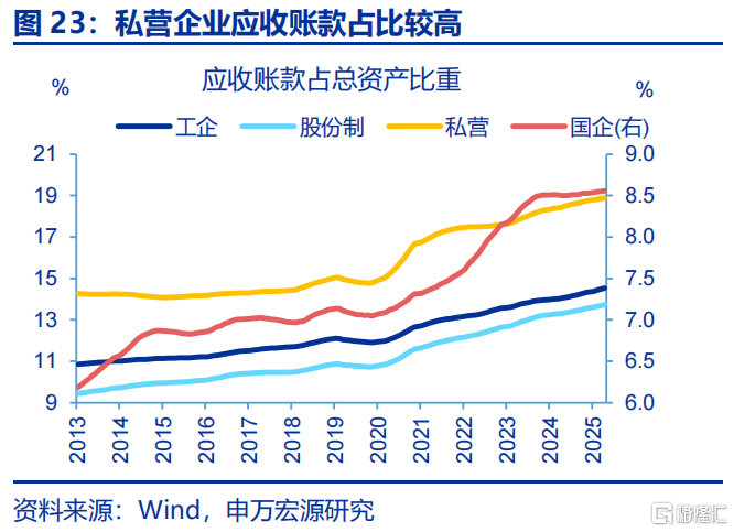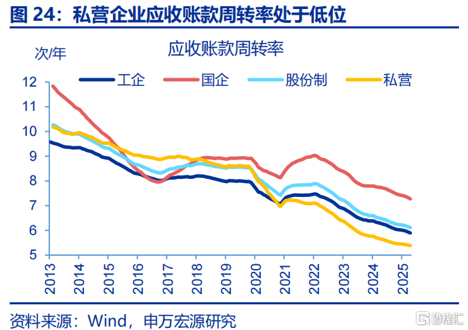 过往经验看,债务问题会挤占企业现金流、对经济运行产生明显压制。企业应收账款占比较高会推升付息压力,或导致资金被过度占用。目前应收账款占总资产比重上升至15%左右,结构上私营企业占比最高(18.9%);并且应收账款周转率下降至6倍左右,处于历史最低水平,私营企业该指标读数也最低。